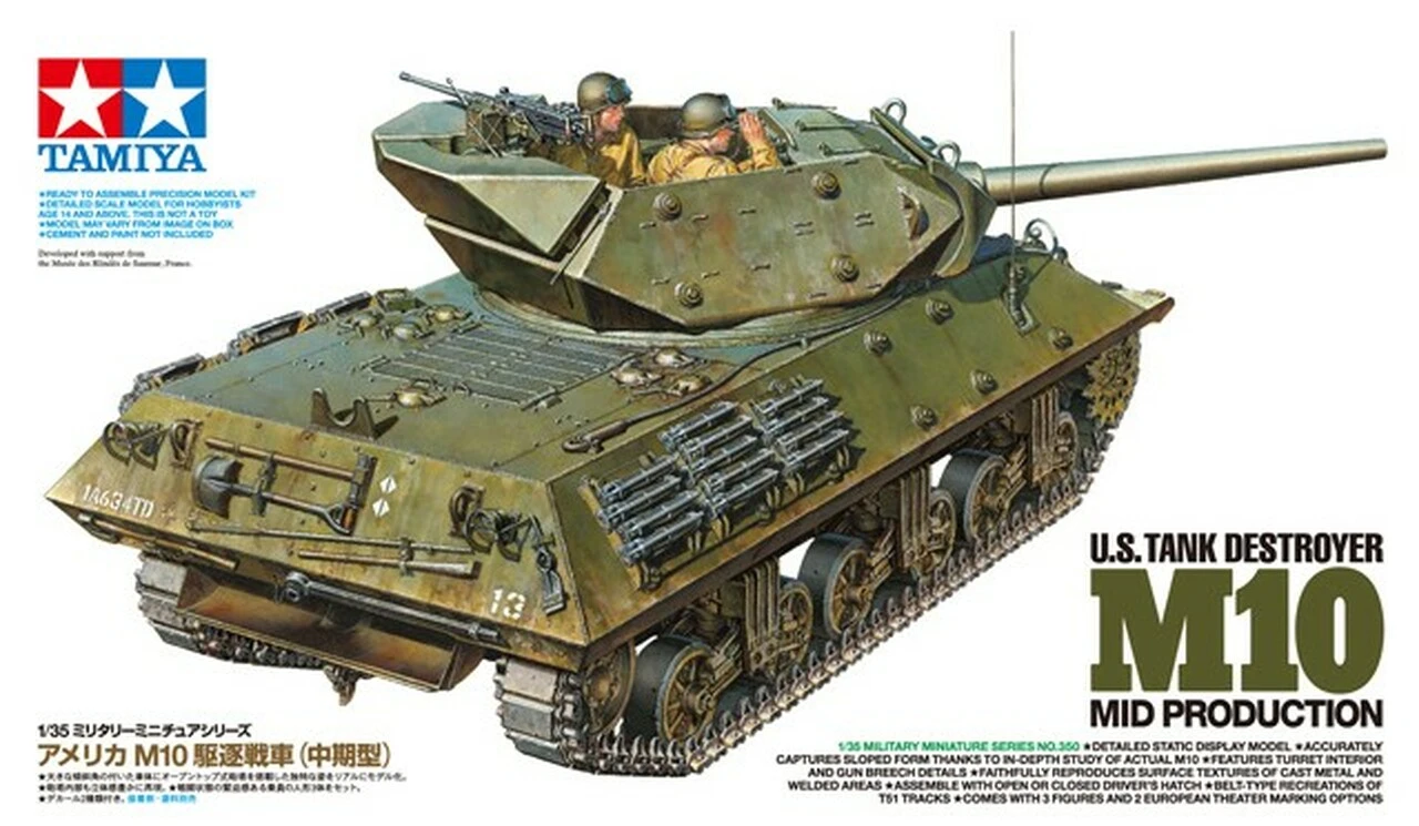 This is a model of the famed M10 Tank Destroyer, a subject also covered in the 1/48 scale Military Miniature series. This largely newly-tooled model (only machine gun and clear parts are taken over from existing models) gives it the glorious detail of the larger 1/35 scale. The astonishing success of German armor tactics in 1940 prompted U.S. forces to adopt a doctrine requiring dedicated new tank destroyers to counter them. After going down a few different design routes at the start of the process, they eventually hit upon the highly successful M10 design with well-sloped (if rather thin, to keep the vehicle light and maneuverable) armor plate, and the highly capable 3-inch (76.2mm) gun. Over 4,900 were produced, and took part in Operation Torch (the invasion of N. Africa), as well as fighting in Italy and the advance upon Germany that would bring the exhausting conflict to a close.
