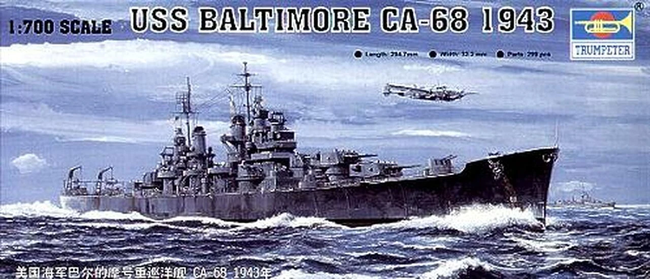 The Baltimore (CA-68) was launched in July 1942, commissioned in April 1943 and reported to the Pacific Fleet. Between November 1943 and June 1944 Baltimore was a unit of the fire support and covering forces at the operations in Southeast Asia. In July 1944 she embarked with President Roosevelt and his party and steamed to Pearl Harbor. Returning to the war zone in November 1944, she was assigned to the 3rd Fleet. In January 1945 she joined the 5th Fleet for her final operations of the war: the Honshu Island attacks, Iwo Jima operations and the 5th Fleet raids in support of the Okinawa operation. After the cessation of hostilities Baltimore served as a unit of the “Magic Carpet” fleet and then as a part of the naval occupation force in Japan. Baltimore received nine battle stars for her service in the Pacific during World War II.