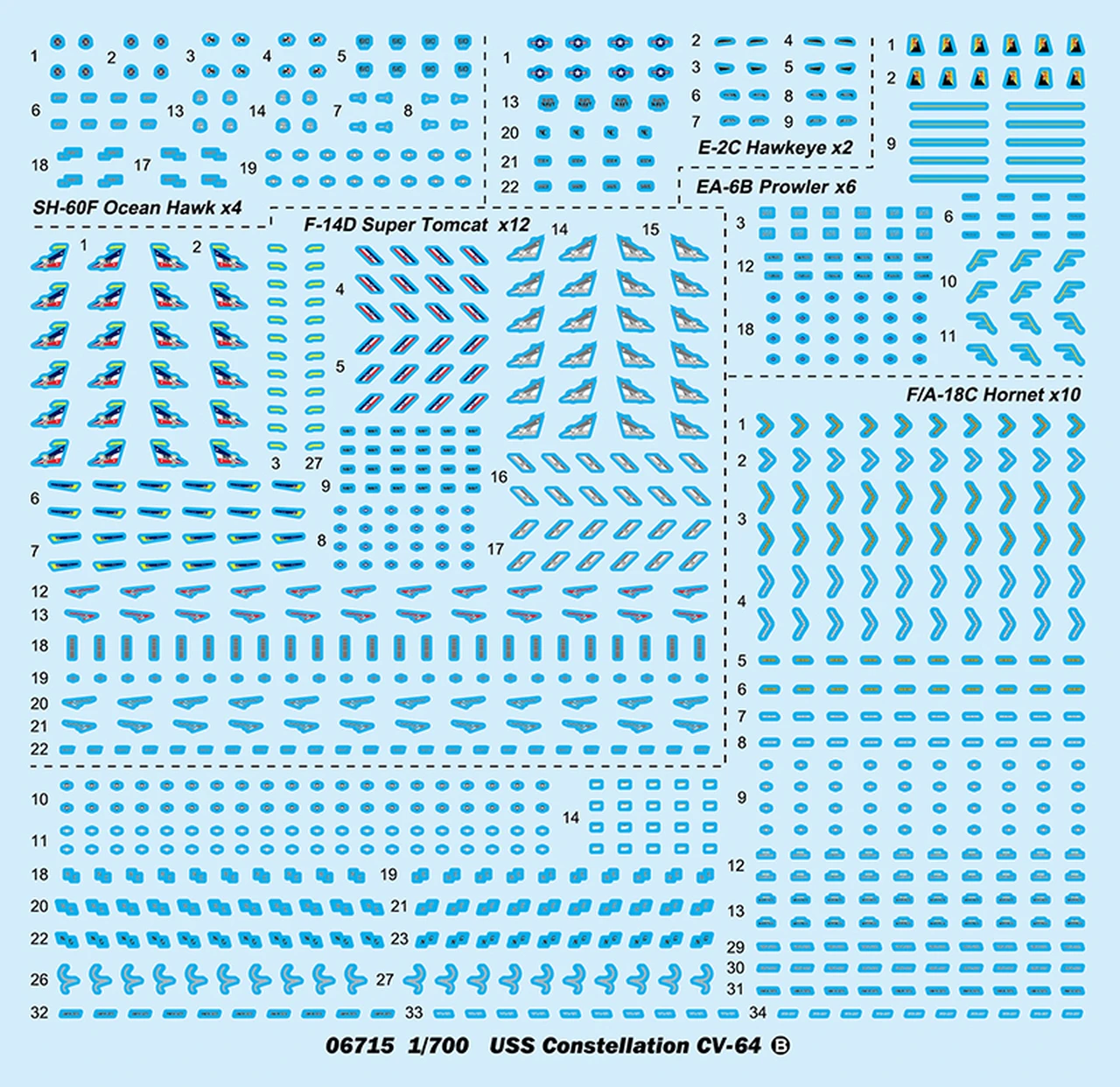 – Includes two E-2C Hawkeye, four SH-60F Ocean Hawk, six EA-6B Prowler, ten F/A-18C Super Hornet and twelve F-14D Super Tomcat aircraft