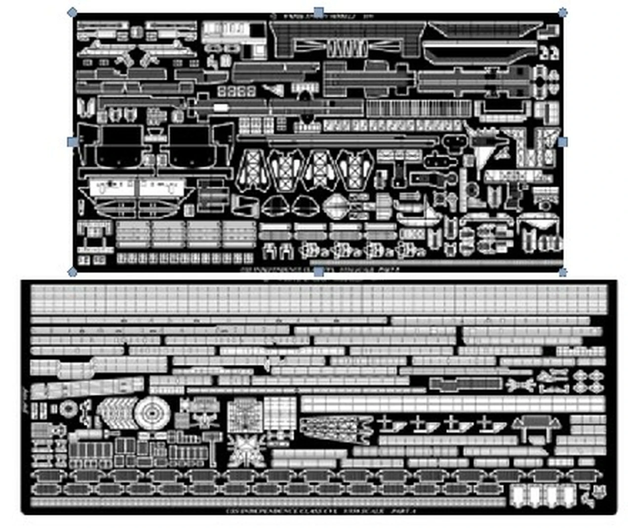 WEM 1/350 Independence Class-Light Carriers – The Ship (PE 35149). For the Dragon kit. Contains: Fret A, Stock 3-Bar Railings, Stock 2-Bar Railings, Railings, Hull Blister (Port), Railings (Catwalk E20), Railings, Ladder Landings, Railings, Hull Blister (Starboard), Railings (Catwalk E27 & E21), Railings (Catwalk E15), Railings (Catwalk E9), Railings (Catwalk E10), Railings (Catwalk E26), Railings (Catwalk E17), Railings (Stern/Fantail), Railings (Aircraft Park Starboard), Railings (Mast Platform H37), Railings (Catwalk E7), Railings (Mast Platform H43), Railings (Compass Platform), Railings (Catwalks E16 & E18), Railings (Catwalk E23), Railing (Topmast Platform Alternate), Railing (Searchlight Platform Alternate), Railing (Flight Deck End Edge Forward), Railings (Catwalk E11), Footrails (Flight Deck Ends), Railings (Deck Park Gun Tub Starboard), Railing Replacement (Kit Part MB30), Fighting Lights Lower (Port), Fighting Lights Lower (Starboard), Railings (Bow), Railings (Catwalk H64), Railing (SG Radar Platform 1), Railings (Crane Base), Footrails (Flight Deck End Forward Under), Railing (Flight Deck End Edge Aft), Footrails (Flight Deck End Aft Under), Safety Nets (Deck Park Starboard), Fighting Lights (Upper), Topmast Pole Yards, Folding Antenna Wire Spreaders, SG Radar Antenna, SP Radar Antenna, SK2 Radar Antenna, SC2 Radar Antenna, SK Radar Antenna, Flight Deck Elevator Railings, SC Radar Antenna, Funnel Rails (Kit Parts I18 & I19), Funnel Rails (Kit Parts I15), Railing Replacement (Kit Part MB7), Hull Side Vent Grilles (Large), Hull Side Vent Grilles (Small), YE Radar Antenna, Aircraft Crane Jib, TBS Antennas, Railing Replacement (Kit Part MB24), LSO Safety Net, Railing Replacement (Kit Part MB25), Railing Replacement (Kit Part MB13), Railing Replacement (Kit Part MB35), Railing Replacement (Kit Part MB17), ailing Replacement (Kit Part MB14), Railing Replacement (Kit Part MB16), Railing Replacement (Kit Part MB18), Railing Replacement (Kit Part MB15), Railing Replacement (Kit Part MB11), Railing Replacement (Kit Part MB22), Railing Replacement (Kit Part MB26), Railing Replacement (Kit Part MB21), Railing (Crane Roof), Railing Replacement (Kit Part MB28), Railing Replacement (Kit Part MB1), Floater Net Baskets (Large), Floater Net Baskets (Small), Stock Vertical Ladder, Funnel Handrails (Kit Parts I22), Funnel Wire Antenna Bracket, Funnel Whip Antenna Brackets, Funnel Wire Antenna Spreader; Fret B, Accommodation Ladder Steps, Accommodation Ladder Rigging, Ladder Landing Rubbing Rails, Accommodation Ladder Handrails, Watertight Doors, Aft Bulkhead for Fantail, Hawser Reels, Aft Hawser Reel Housing, Aircraft Deck Park Decking, Deck Park Supports (Long), Deck Park Supports (Short), Port Flight Deck Park Plate, Replacement Catwalk Part E26, Replacement Platform H31, Whaleboat Rudders, Reproducer Faces (Round), Replacement Catwalks E15, Replacement Catwalk H64, Funnel Wire Antenna Spreader, Hawser Reel House Doors, Replacement Catwalks E20, Replacement Catrwalks E27, Reproducer Faces (Pivoted), Topmast Pole Gaff, Replacement Catwalk E16, Replacement Catwalk E18, Replacement Catwalk E9, Replacement Catwalk E10, Inclined Ladders for E9 & E10, Handrails for E9 & E10 Ladders, Loading Davits, Replacement Catwalk E7/E19, Inclined Ladders (Short), Forward Splinter Shield Venturi, Replacement Catwalk E17, Replacement Catwalk E23, Temorary Flight Deck Windbreaks, Island Starboard Catwalk, Catwalk E11, Reproducer Faces (Rectangular), Windbreak Supports, Yardarm Gear, Forward Gun Tub Front Supports, Forward Gun Tub (Port), Forward Gun Tub Platform (Port), Forward Gun Tub (Stbd), Forward Gun Tub Bulkhead (Port), Forward Gun Tub Bulkhead (Stbd), Forward Gun Tub Centre & Rear Supports, Modified Forward Catwalks, Funnel Bracing (F27/F11/F13), Port Catapult Track, Starboard Catapult Track, Funnel Bracing (F28/F10/F12), Funnel Bracing (F29/F14/F16), Funnel Bracing (F30/F15/F17), Replacement Mast Platform H1, Replacement Mast Platform H43, Alternative Mast Platform H43, Alternative Mast Platform H37, Mast Platform Front Support, Replacement Lattice Mast, Crane Hook, Forward Hull A Opening Blanks, Forward Hull Bulge (Port), Forward Hull Bulge (Stbd), Propeller Guard Frames, Propeller Guard Supports (Solid), Propeller Guard Supports (Open), Propeller Guard Underside Supports, Ladder & Landing Kit Part H40, Anchor Chain Stops, Mast Short Yardarm Footropes, Mast Full Yardarm Footropes, Replacement Mast Platform H37, Alternate SG Radar Platform, SK Radar Platform, Inclined Ladder, Alternate Mast Platform H1, Topmast Pole SG Radar Platform, Yardrm Footropes (Independence), Yardarm Footropes (Topmast Pole), Bridge Windscreens & Canopy, Bridge Side Screens, Elevator Cables & Pulleys