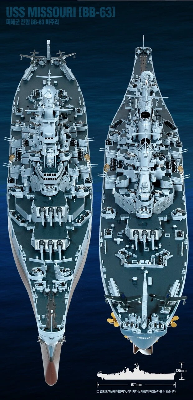 The construction of BB-63 began in January 1941 in the New York Navy Yard as the third ship of Iowa class battleships. Entering service in June 1944, Missouri became the temporary headquarter of the 58th high-speed task force. When she participated in the battles of lwo Jima and Okinawa she was slightly damaged by kamikaze attacks. After the surrender of Japan she entered Tokyo Bay as the flagship of the 3rd fleet. It is well known that the instrument of surrender was signed on her deck. After the war the Iowa-class ships returned home and served as training ships for new officers. When the Korean War began in 1950, all of those ships re-entered service to bombard Wonsan, supporting the landing operation. During the Vietnam War the sole Iowa class ship to serve was the USS New Jersey. In 1980 the Reagan administration ordered the revival of Iowa class battleships to build up the US naval force and Missouri was modernized and re-entered service in July 1986 with Harpoon, Tomahawk, and cutting-edge electric devices. In January 1995, four years after participating in the Gulf War with Wisconsin, she and other three were finally deleted from the Navy list, ending careers of more than fifty years.