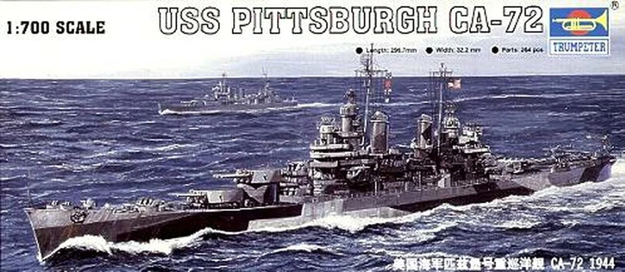 The Pittsburgh (CA-72) was laid down in February 1943, launched in February 1944 and commissioned at Boston in October 1944. She joined TF 58 in February 1945, around the same time as aircraft carrier Lexington (CV-16). Between March 23 and April 27, 1945 Pittsburgh guarded the carriers as they first prepared for and then covered and supported the invasion of Okinawa. Enemy airfields were interdicted and the troops given direct aid from the carriers. Pittsburgh repelled enemy air attacks and launched her scout planes to rescue downed carrier pilots. On June 4, 1945 Pittsburgh lost her bow in a typhoon which by early the next day had increased to 70-knot winds and 100-foot waves. Armed with a false bow, Pittsburgh left Guam on June 24, bound for Puget Sound Navy Yard and arriving on July 16. Still under repair at war’s end, she was placed in commission in reserve March 12, 1946 and decommissioned March 7, 1947. Pittsburgh received two battle stars for World War II service.