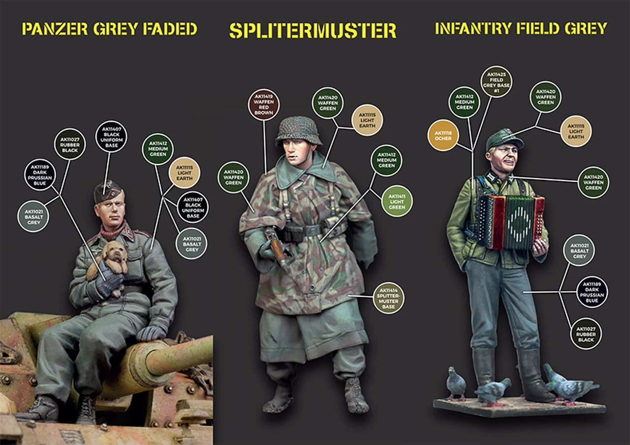 This signature set includes a selection of 18 colors considered by him essential to be able to paint a wide variety of WWII German uniforms in miniatures with the best acrylic paint on the market.