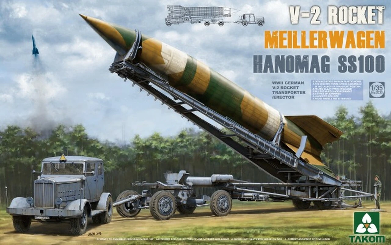 V-2 was the world’s first long-range guided ballistic missile. The Meillerwagen was a German World War II trailer used to transport a V-2 rocket from the ‘transloading point’ of the Technical Troop Area to the ‘launching point’, to erect the missile on the Brennstand firing stand and to act as the service gantry for fueling and launch preparation. The Hanomag SS-100 tractor was a civilian vehicle that was pressed into military service.