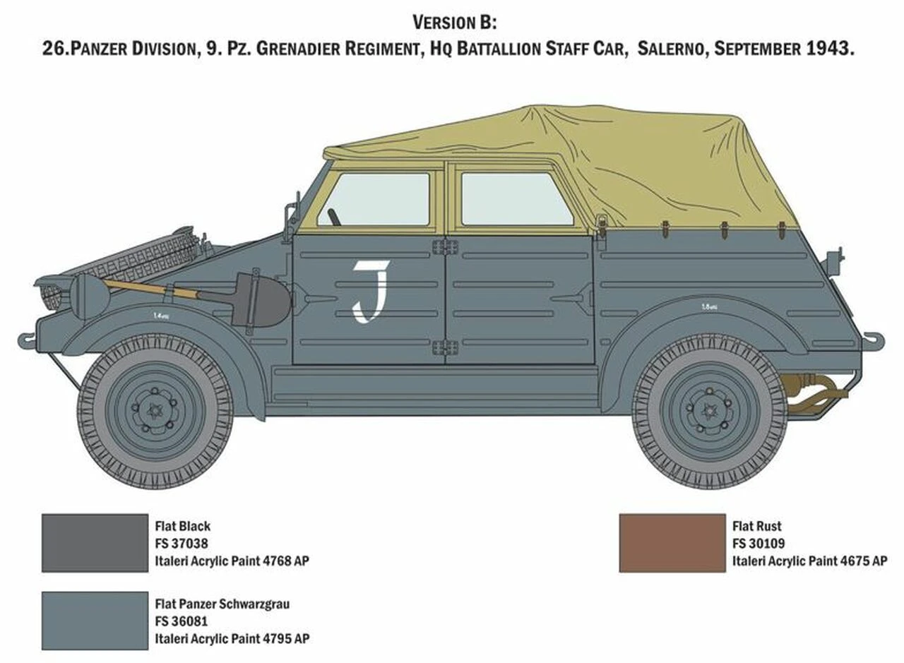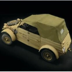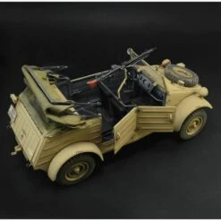 Typ 82 Kubelwagen is one of the most famous military cars of the Second World War. It was designed by the engineer Ferdinand Porsche and produced by the German manufacturer Volkswagen. The project was born to have a simple vehicle, easy to build and easy to maintain and repair. The overall vehicle design is without bends and the bodywork plates are flat. Great simplicity even in the layout of the frame : just a central tube and the back support for the engine and the gearbox. The Kubelwagen, thanks to its petrol engine with a displacement of 998 cm3, was able to reach the max speed of 80 Km/h. The vehicle did not have 4×4 traction but it was extremely reliable on all types of terrain and it was present on all fronts, often in very tough environmental conditions, where the German Army fought during the entire World War II. The Kubelwagen could be armed with a support for a MG34 or MG42 machine gun.