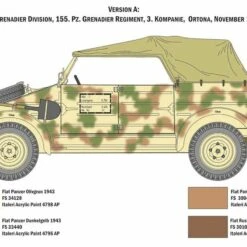 Working suspensions – Openable lid – Higly detailed engine – Higly deteiled decals sheet – Canvas roof and windows – Working canvas roof – Steering front axle – Rubber tires – Colors instructions sheet