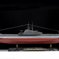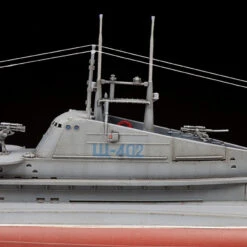 The Shch 402 was part of the most numerous class of medium sized Soviet X – type submarines during WWII called “Shchuka”. With a length of 57 m, it featured improved underwater streamlining and increased surface speed. Built in Leningrad, after crossing the White Sea-Baltic canal in 1937, it joined the 2nd submarine division of the Northern Fleet. During WWII it participated in 16 raids, commanded by the captains N.G. Stolbov and A.M. Kautsky. 1942 it was awarded the Order of the Red Banner of the Battle, and in 1943 the rank of Guards. Shch 402 disappeared without a trace in a military campaign, presumably sunk in a minefield off the coast of Norway at the end of September 1944.