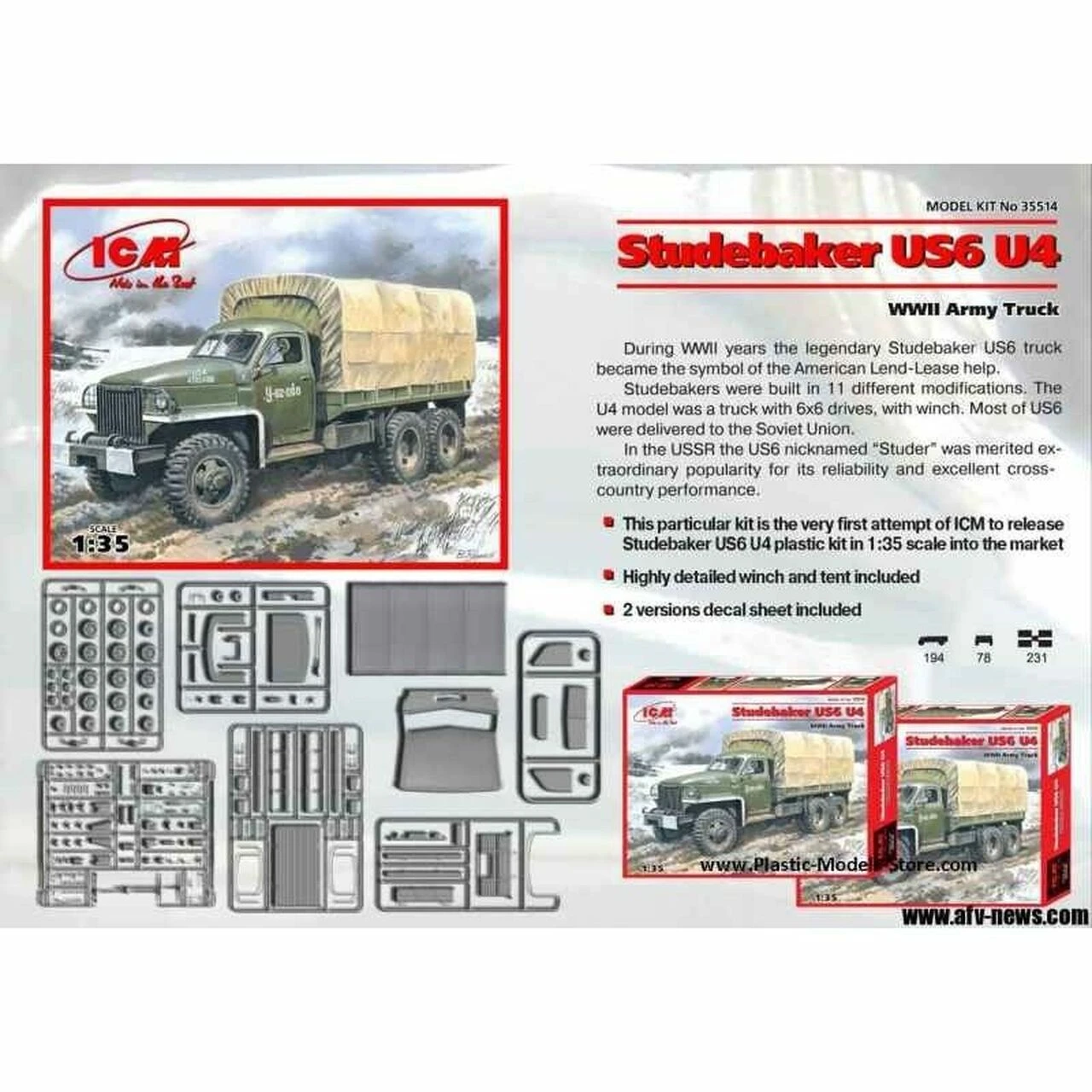 During WWII the legendary Studebaker US6 truck became the symbol of the American Lend-Lease program. This excellent car was developed following a US government order and the first mass-production unit left the line in June 1941. The US6 wasn’t accepted as the standard US Army Truck and so Allies became the main users. Most of them were delivered to the Soviet Union, where they were used in the Red Army to carry loads, soldiers and goods as well as gun tractors. They also became a base for several installations, such as various multiple launch rocket systems. Studebakers were built in eleven different modifications; the U4 model was a 6 x 6 with a winch.